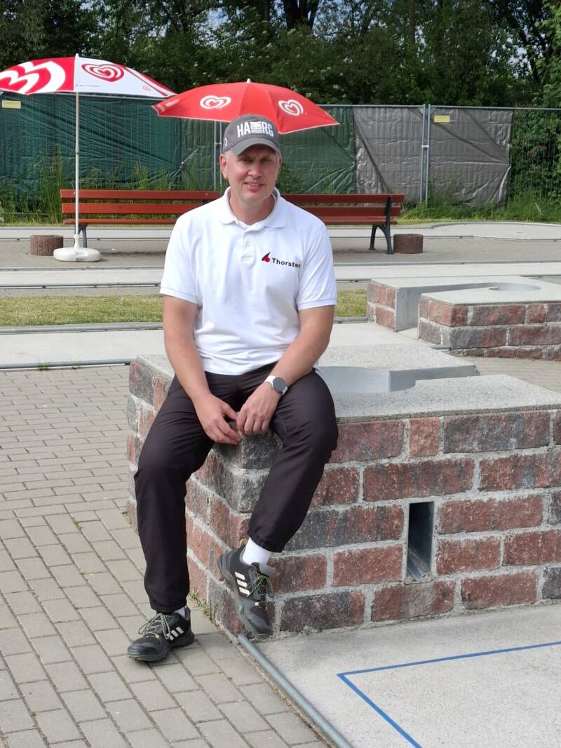 Beim dritten Meisterschaftsturnier ging es für die erste Mannschaft des VfM Bottrop an den Auesee auf die neue Betonanlage des MSC Wesel. Der Platz ist zwar neu, aber durch Baumängel gilt er als durchaus schwierig. Und trotzdem wurden am Sonntag Rekorde erzielt, was aber bei neuen Bahnen häufiger vorkommt. So purzelte der Rundenrekord schon in der ersten Runde durch Tristan Kleiner aus Wesel auf 24 Schläge und wurden dann gleich drei Mal eingestellt. Als es dann in den vierten und letzten Durchgang ging, wurde diese 24 tatsächlich von dem Bottroper Thorsten Schmidt noch auf 23 verbessert. Mit Können, natürlich einer Portion Glück und mit seiner Coolness erzielte Schmidt in dieser Runde 13 Asse, 7 davon auf den ersten Bahnen direkt hintereinander, und nur fünf Zweier.